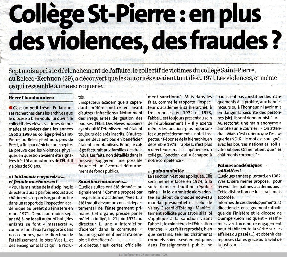 La collecte d'indices et de lettres tapuscrites parfois agrémentées de notes manuscrites prouve que l'éducation nationale par le biais de l'inspection académique, à plusieurs reprises, était parfaitement informée des dérives d'un collège protégé par la hiérarchie de l'enseignement catholique. Le descriptif du journaliste du Télégramme Hervé Chambonnière, publié le 25 septembre 2025, est éloquent bien que le reflet rédigé soit le condensé d'un abus de confiance moral et factuel de l'Eglise à l'égard de son devoir de probité inscrit dans la loi. On s'aperçoit que cette autorité à qui l'on donnerait le bon dieu sans confession, a poursuivi la dénaturation de son enseignement. Le père Yvon L., principal acteur des dérives, quitte l'établissement (1977) pour être muté en tant que curé de paroisse au Conquet. Après ce départ, le nouveau directeur, Jean Le G. (professeur de français et d'histoire géographie du collège) n'abandonne pas la violence éducative jusqu'à son propre départ en 1987, alors que le collège est devenu mixte (1985) sous une autre appellation dès 1988. Les ultimes élèves victimes se plaignent de maltraitances en l'année 1998. Le ministère de l'éducation nationale était donc saisi dès 1971... L'absence de sanctions contraignantes de la part de l'Etat a permis à l'enseignement catholique du Finistère de prospérer à bien des titres, plus ignobles les uns que les autres.